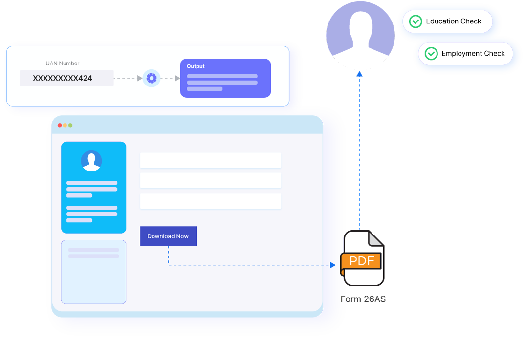 Fetches Form 26AS from the Income Tax portal using PAN and address details to verify employment details in real-time.